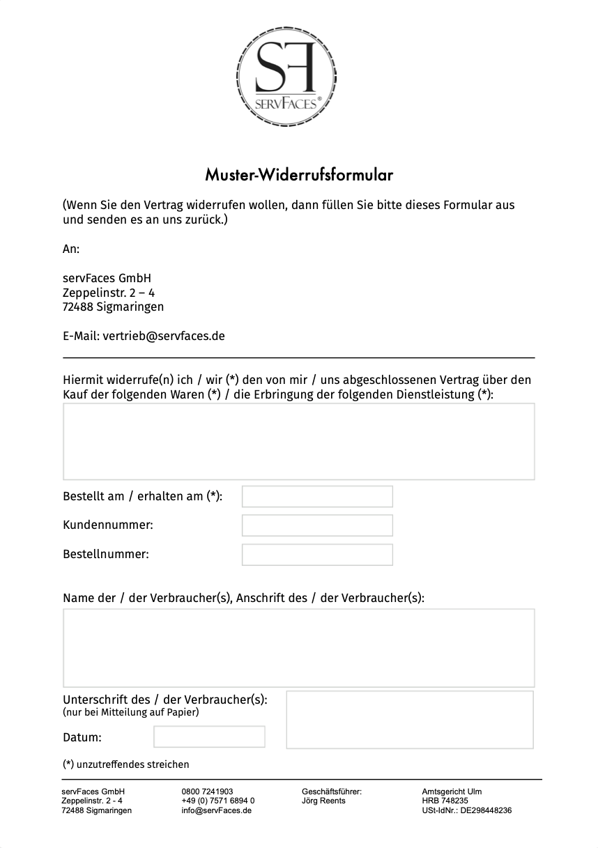 Sie haben die Waren unverzüglich und in jedem Fall spätestens binnen vierzehn Tagen, an dem Sie uns über den Widerruf dieses Vertrages unterrichteten, an uns zurückzusenden oder zu übergeben. Die Frist ist gewahrt, wenn Sie die Waren vor Ablauf der Frist von 14 Tagen absenden. Sie tragen die unmittelbaren Kosten der Rücksendung der Waren. |